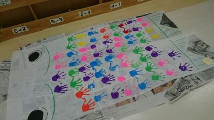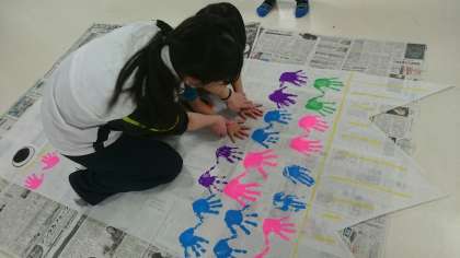 何をしているのかと思ったら、白い布に一人一人の手形を押していました。