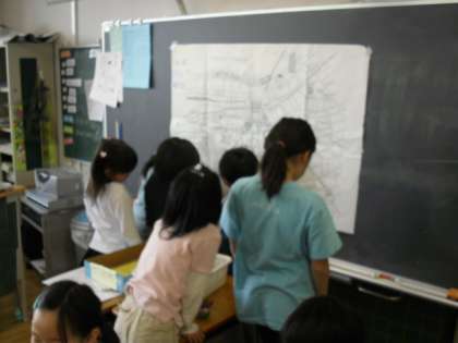取材メモをもとに地図に書き込み、自分たちの町を見つめます。