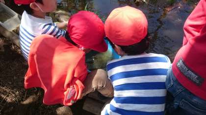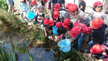 1年生は、池の周りでおたまじゃくしやエビを捕まえたり、きれいに咲いた水辺の花を観察したりして楽しんでいました。