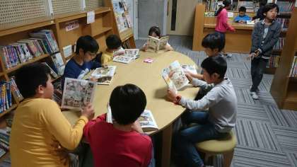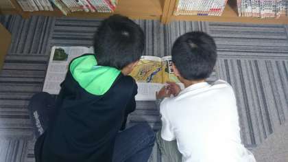 夢中で本を読んでいる子、友達と一緒に何かを調べている子。
