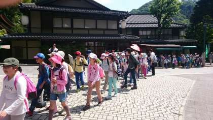 高尾山口の駅から登山道の入り口に向かい、グループごとに登山の始まりです。