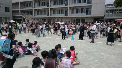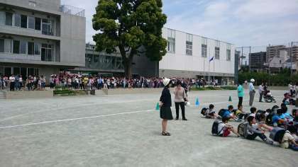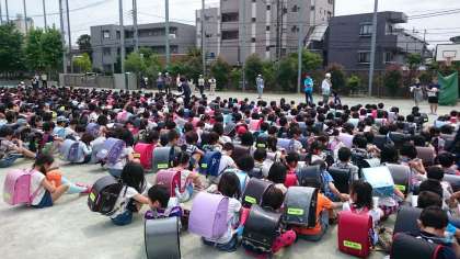 避難訓練での校庭避難も2回目となり、全校児童816名の避難完了、校舎内の安全確認に要した時間は約6分半。