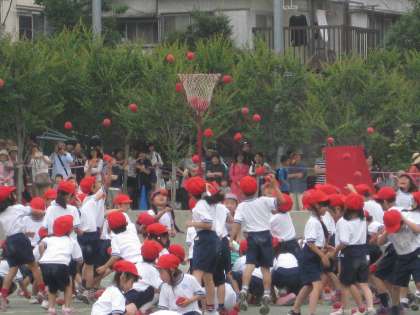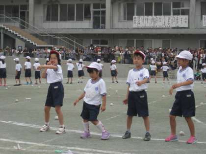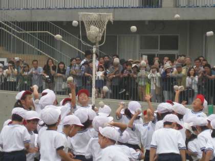 1年生の玉入れは、玉を投げる前に一踊り。