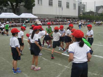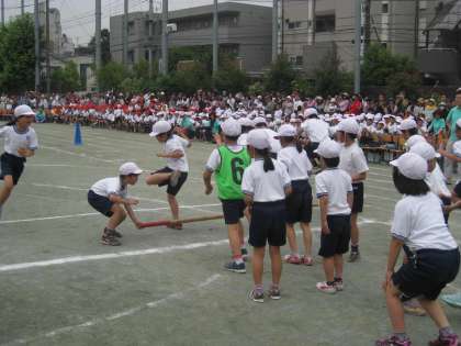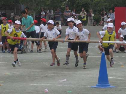 長い竹の棒を横向きに持って走り、並んでいる味方の足元を通します。