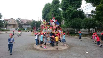今年は160名をこえる大所帯ですから、赤松公園は赤い帽子の1年生でいっぱいになりました。遊具に群がって元気いっぱいに遊びました。
