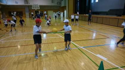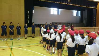 今日の2時間目の4年2組の体育は、いつもと様子が違い、たくさんのお兄さんお姉さんが参加していました。参加して下さったのは、日本大学文理学部体育学科准教授の水島宏一先生と体育学科の3年生です。学生は、指導法の学習として、子どもたちにとっては一緒に運動を教えてくださる先生として、互いに充実した時間を過ごすことができました。