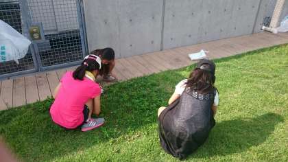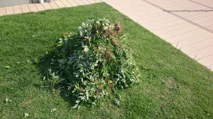 夏休みに入る前に少しでも抜いておかないと芝生スペースに雑草が生い茂ってしまうので、連休前にボランティアを募ったところ、10人ちょっとの6年生が参加してくれました。朝から気温が高く、蒸し暑かったですが、約30分の作業で、写真のような雑草の山が2つできました。