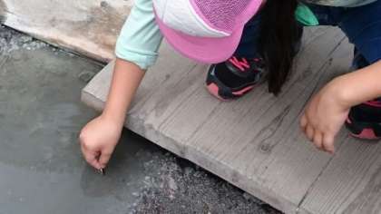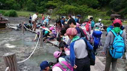 湯元の源泉に来ています。白く濁った地面からプツプツと泡が吹き出しています。