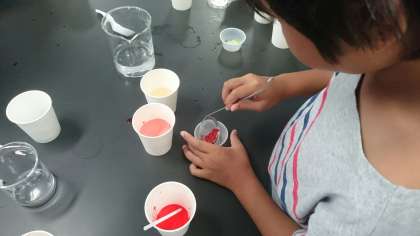 色のついた液体を塩化カルシウムにストローで垂らすと、あら不思議。