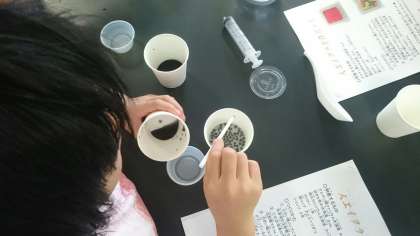 注射器でアルギン酸ナトリウムを9mlとり、赤、黄色、黒の液体を3ml加えます。