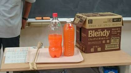 形の違うペットボトルに入った色水。どっちが多いかかと聞かれて、一人ひとり自分の考えをノートに書いてから発表しました。