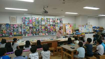 2年生はいつもだったら図工室では学習をしないのですが、特別に図工室で学習をしていました。それは展覧会に向けての共同作品製作を宮崎太郎先生に指導していただくためです。