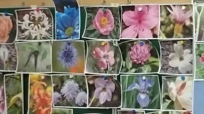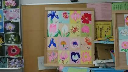 図工室に入ってまず目に飛び込んできたのは黒板全面に張り巡らされた美しい花の写真と宮崎先生が描いた花の絵。その鮮やかさと迫力に吸い込まれてしまいそうでした。教師は1時間の授業に全力でエネルギーを注ぎます。そのエネルギーに子どもたちの心が揺さぶられて活動への意欲につながります。
