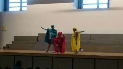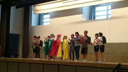 松沢小学校が元気なあいさつで溢れるようにと、劇を披露しました。