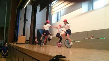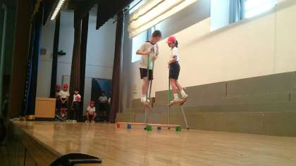 ボールを投げ上げてからマットで前転をしてキャッチ。竹馬に乗って障害物をよけて歩いたり、ケンケンをしたり。ダブルダッチに一輪車も登場して、大いに降りあがりました。全校の視線がステージの上に釘づけになりました。