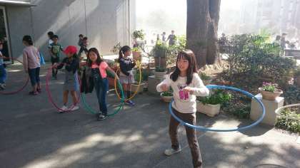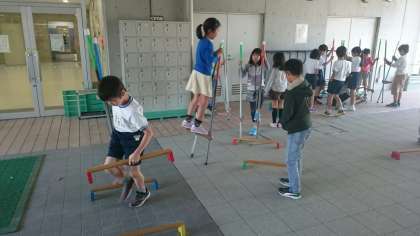 早速、中休みは、竹馬、一輪車、フラフープの各ゾーンが子どもたちでいっぱいです。