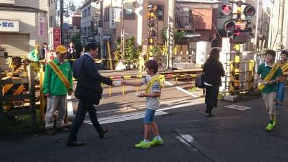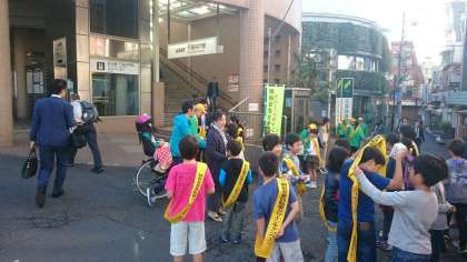 駅に向かう人たちに「おはようございます」のあいさつと共に、ティッシュを配布しました。このボランティア活動は毎年5年生が行っています。