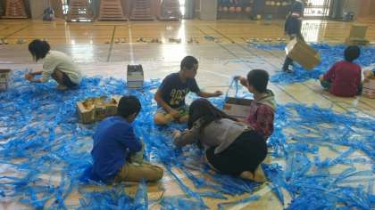 体育館で何やら6年生が作業をしています。
