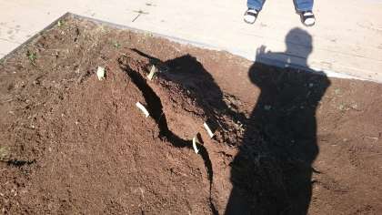 屋上に土の山を作って、5年生が流れる水の働きについて実験をしていました。