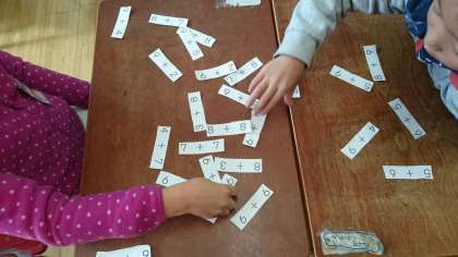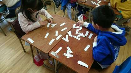 机の上に足し算のカードを並べて、カード取りゲームをしています。
