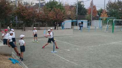 6年生が体育の学習で、ベースボール型のゲーム「Tボール」を行っていました。