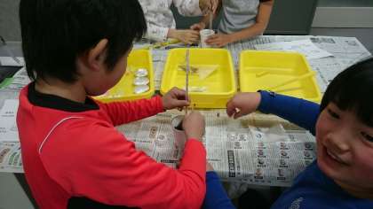 鉄粉と炭に食塩水をませてかき混ぜると、どんどん温度が上昇します。紙コップを二重にしていましたが、かなりの熱さに子ども達は「すごい熱気だ!」と驚いていました。