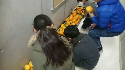 栽培委員会がビオトープのそばの夏ミカンの実をもいできました。
