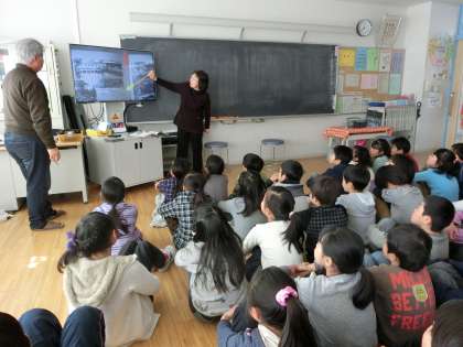 昔の松沢小学校の校舎や校庭の様子、授業のことやチャイムのこと給食や遊びのことまでたくさんのことをお話していただきました。お話が終わってからの質問コーナーでは、いつまでも質問が途切れずに終了の時刻となってしまうほど興味深いお話をしてくださいました。