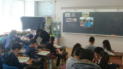 担任の先生が数枚の写真を提示して子どもたちが思い思いの発言を順番にしていました。