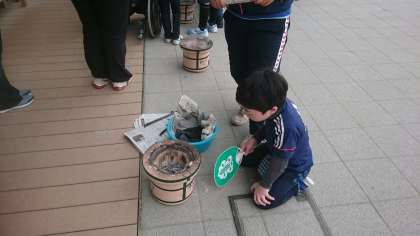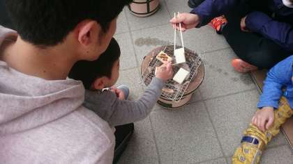 6年生が必死に仰いで火をおこして、その火を利用してお餅を焼いてみんなでおいしくいただきました。