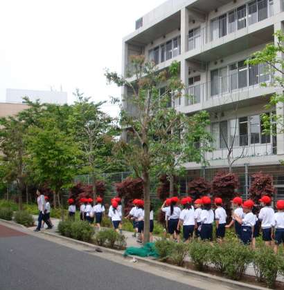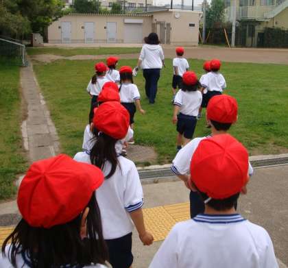 体育着を着て静かに並んで学校を出発する1年生のクラス。松沢小の第二校庭へ出かけました。第二校庭は学校の南側、50m位のところにあり、学校を出て歩いてすぐです。短い道のりですが学校の外に出るので、いろいろな社会のマナーに従って行動します。第二校庭は芝生になっています。1・2年生は週に1回程度、体育の授業が第二校庭に割り振られています。今日、広い芝生の第二校庭を見て、目を丸くしていました。