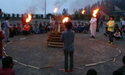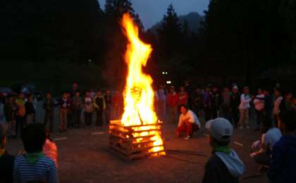 1日目の夜は「史上最強のキャンプファイヤー(司会の子の言葉から)が行われました。松沢サンバで盛り上がったところに、火の神が登場。火の神から炎を火の子たちが分けてもらい、決意も高らかに点火してキャンプファイヤーが始まりました。ゲームをしたり、歌ったり、踊ったり、ものすごい盛り上がりの中、夜が更けていきました。みんなで楽しむ素晴らしさを子どもたちは感じていました。