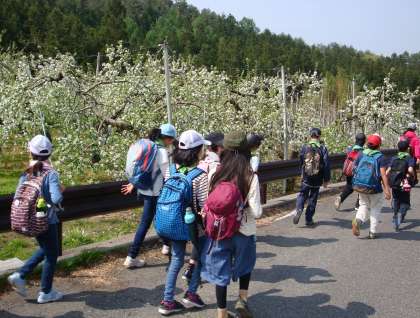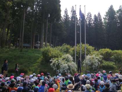 一枚目の写真が、川場村世田谷区のなかのビレッジの建物の写真です。広場で閉室式をやり、掲揚していた校旗を下ろしました。リンゴの花が満開の中、なかのビレッジを後にし、さわやかな天気の中、川場村の村巡りに出発しました。