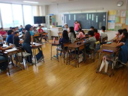 4年生のクラスで学級会が行われました。学級の係を決める話し合いでした。話し合いのめあては「一人一人が意見を言う」でした。テキパキと司会が進める中、たくさんの意見が発表されていました。ときどき、話がそれてしまうと、先生が助言し、方向が修正されていました。こうして、話し合い活動を通し、子どもたちは自治の力もつけていきます。