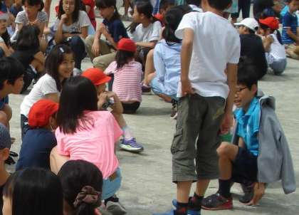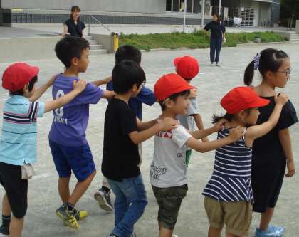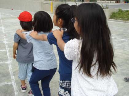 全校の朝の児童集会、今日はじゃんけん列車集会でした。集会委員がマイクで楽しく歌う「♪貨物列車シュシュシュ〜」の声にのってゲームが進みました。列が8人になったところで、丸くなって座り、自己紹介をしあいました。よくやるゲームに少し工夫し、より楽しく交流できるように考えられていました。