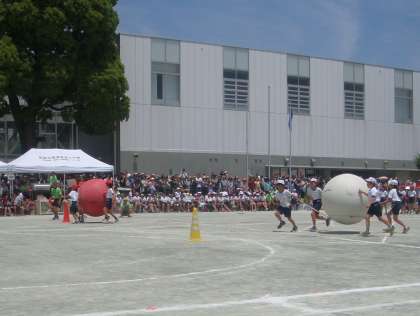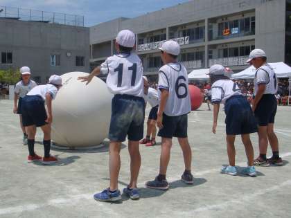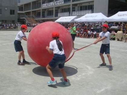 4年生の団体競技は「キャリーB,B」。フラフープにひもをつけ、そこに大玉をのせて4人で運ぶ競技です。4人の呼吸をぴたりと合わせ、素早く大玉を運びます。チームワークが決め手の競技でした。