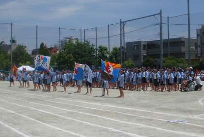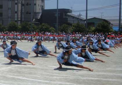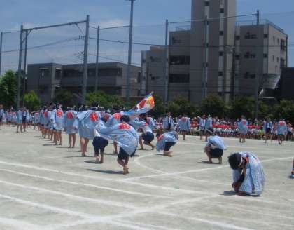 クラスごとにつくった大漁旗が走り抜け、踊りが始まりました。大きなかけ声と迫力のある踊りは見ている人を釘付けにしました。最後は「130周年おめでとう」の横断幕が登場、大きな拍手に包まれました。はっぴは下高井戸の商店会からお借りしました。