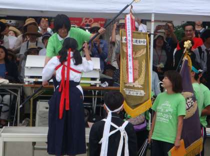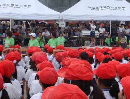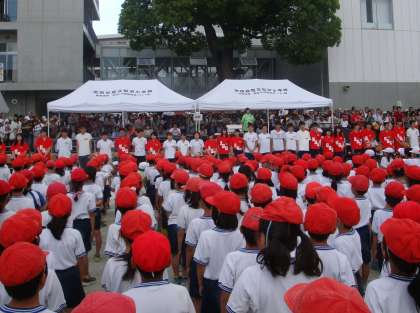 採点係の子どもの得点発表に会場の全員がドキドキ(1枚目の写真)。赤が勝ちました。赤組の応援団長に優勝旗が渡されました(2枚目の写真)。日大の学生がボランティアで1日運動会のお手伝いをしてくれました。子どもたちの様子を見守ったり、水をまいてくれたり、用具の準備をしてくれたり、片付けの手伝いをしてくれたり。みんなで感謝(3枚目の写真)。