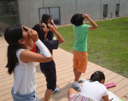 3年生が屋上で太陽の動きの観測をしていました。太陽めがねという道具を使うと、裸眼で見るととても危険な太陽をめがねを通して直接見ることができます。円形に見えることがよくわかります。