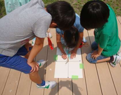 棒の影の動きをグループごとで記録していきます。影の動きを通して、太陽の動きに気づいていきます。