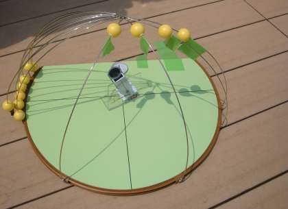 3枚目の写真は太陽の動きを立体的に表現できる教具です。真ん中の筒に影がきれいに収まる場所に太陽代わりの黄色い球をもっていき、固定していきます。