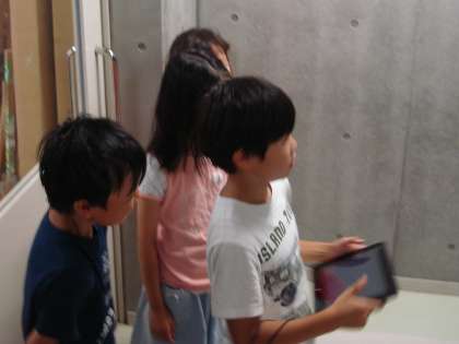 3年生の総合の学習で「松沢小にある顔に見えるところ」を探し、1年生に発表するという授業が行われました。カメラ付きタブレットPCをグループで持って、学校の中を歩きながら、顔に見える部分を探しました。楽しい思いで見ていくと、見慣れた壁にもいろいろな顔が隠れていることに気付きます。