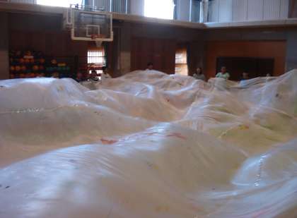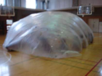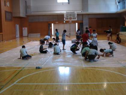 テープでつないでつくった9m四方のビニールシートにクラスみんなでわいわいと絵をかいていきました。大きなシートをみんなで持って揺らすと、バサバサと音を立てて波のような動きをします。さらに、みんなでビニールを持ち上げて中に入ると、すてきな絵につつまれたドリームドームの完成です。クラスみんなで楽しい時間を過ごしました。(8日に3組、今日2組をやりました。1・4組はこれからです。)