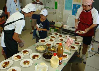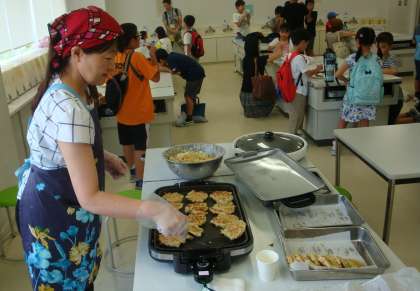 北校舎3階では「ペットボトルボウリング」と「ミニおこのみやき」が行われました。ボウリングはなかなかストライクがでませんでしたが、スペアーは結構でていました。家庭科室ではミニお好み焼きが食べられました。いったいいくつのお好み焼きを焼いたのでしょう。来た子どもたち、みんながおいしく食べました。