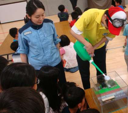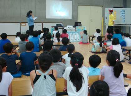 水再処理センターの方々が「下水道キャラバン」で下水道に関する話や実験を4年生にしてくれました。模型の街並みにじょうろで水を入れます。するとどんどん水が下水道に流れていくようすがわかります。どこかに詰りがあると、あっというまに道路にあふれ出てしまうこともわかりました。「汚水ます」と「雨水ます」があることや、実験をとして下水がきれいになる仕組みを学習しました。家庭でも水の行き先について話題にしてください。