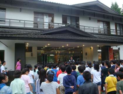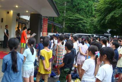 宿舎についての最初のイベントは開園式です。雨があがり、予定通り外で行いました。宿舎の人の話を聞き、代表の児童があいさつをしました。これからここではじまる3日間、わくわく感が高まっていきました。
