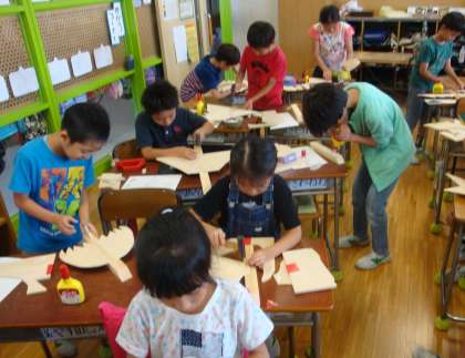 9/13 3年図工電動糸鋸を使って 公開日 2017/09/14 更新日 2017/09/14 できごと 3年生の図工の授業では電動糸鋸を使って飛行機をつくっていました。子どもたちは慣れた手つきでスイスイと板を切っていました。板を切ってつくった翼を胴体に釘でつけていました。初めての金づちでしたが、すぐにうまく打てるようになっていました。図工ボランティアの方が子どもたちを支援してくださいました。 いいね(0)