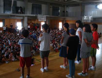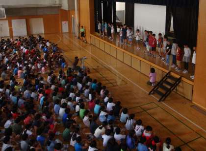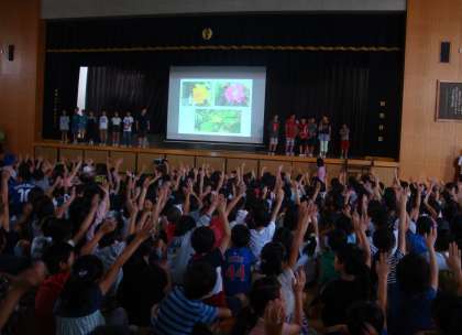 栽培委員会の発表が行われました。仕事の内容を紹介したり、植物についてのクイズがあったり、楽しい集会になりました。委員全員が舞台の上で全校の前に立ちました。900人近い視線を受けてあいさつしたり、マイクを持って話したり、子どもたちはこういった発表を通して貴重な経験をしています。