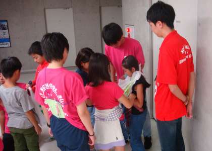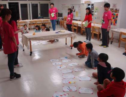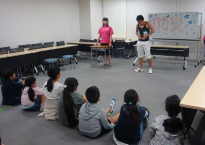 非常炊き出しのアルファ米を食べた後、グループごとに夜の校舎を巡りながら、防災について学んで行きました。校舎内のあちらこちらに日大の学生さんがコーナーを設け、防災に関することを、カルタで伝えたり、寸劇で伝えたり、クイズで伝えたりしてくれました。それぞれのコーナーとても工夫されていて子どもたちは楽しく回っていました。