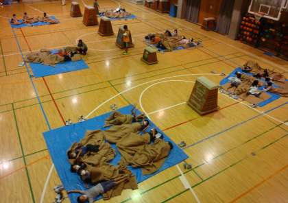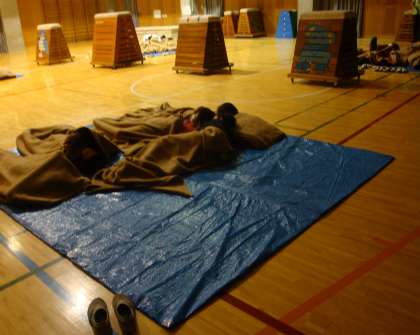 避難所を想定し、みんなで体育館で寝ました。50人を超す人と一緒に寝る体験はなかなかできるものではありません。みんなで上手にお互いを思いやりながらしかも自分もしっかり寝るという訓練をしました。